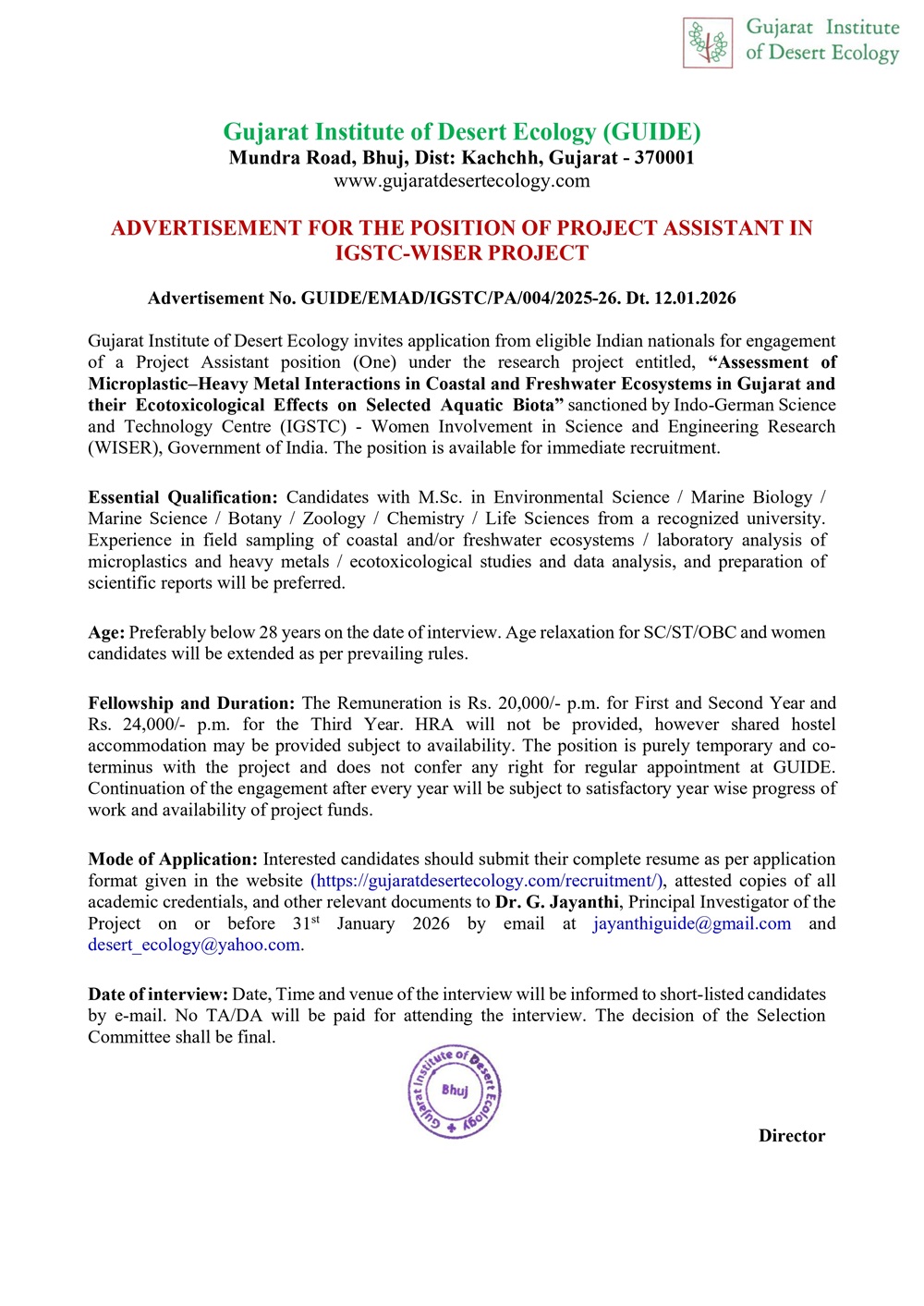 ADVERTISEMENT NO. GUIDE/EMAD/IGSTC/PA/004/2025-26. DT. 12.01.2026